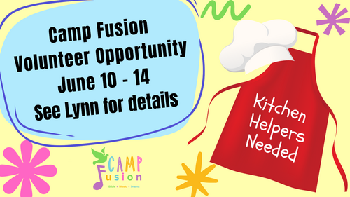 We still need a couple of people to help prepare lunches during Camp Fusion next week - June 10-14. All food will be there and we just need some more help to put the lunches together. Even if you can only help one day that would be great!!! Please contact Lynn Warner for further information!