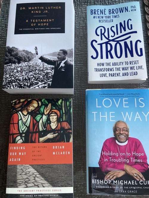 There are four new books on the New Book shelf in our library. If you haven't been there in a while it's time for a visit - the library is open everyday, even on Sunday mornings. We have Bishop Michael Curry's Love is the Way: Holding onto Hope in Troubling Times; Brene Brown's Rising Strong: How the Ability to Reset Transforms the Way we Live, Love, Parent, and Lead; Brian McLaren's Finding Our Way Again: The Return of the Ancient Practices; and A Testament of Hope: The Essential Writings and Speeches of Dr. Martin Luther King, Jr.