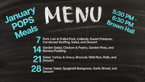 Menu: Pork Loin & Pulled Pork, Collards, Sweet Potatoes, Cornbread Stuffing, Salad, and Dessert. Cost is $25/family, $7/adult, and $5/under 12.