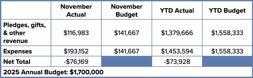 Giving for the Capital Campaign has exceeded all expectations! However, giving for our operating expenses is behind. Currently, we have 158 pledges for $1,050,000. That is over $100,000 behind last year. Prayerfully consider your giving for this year. If you still need to pledge for this year, please contact Susan Dykes at church office.