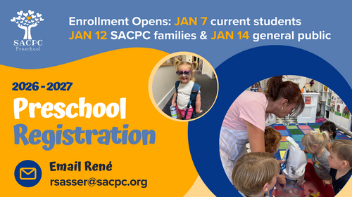We are excited to announce the upcoming registration dates for our SACPC preschool for the 2026-2027 school year! We look forward to welcoming both returning and new families to our program.