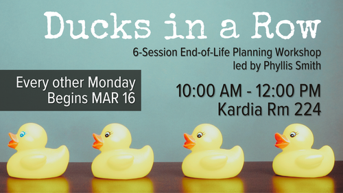 Due to overwhelming demand a new Ducks In a Row class will begin on Mondays from 10:00 am - 12:00 pm starting March 16 in Kardia Rm 224. These classes meet every other Monday through May 18. Future class schedule includes March 30, April 13, April 27, May 11, and May 18.