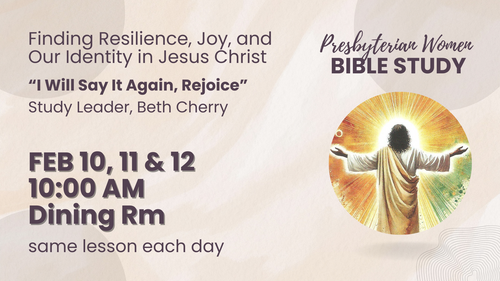 February’s Presbyterian Women’s Bible study will be led by Beth Cherry. The theme is Finding Our Joy in Christ: “I Will Say It Again, Rejoice”. Christian joy emerges from a deep belief that God is good, and God reigns forever. Main scripture passage is Philippians 4:1-23. The same lesson is given each day.