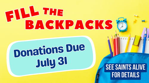 July Donation Drive Begins July 1 In July we will have one of our favorite collections--providing backpacks and school supplies for children in need in our community. We can use backpacks for children from kindergarten through high school. Supplies we'll collect include: pens and markers, pencils and colored pencils, crayons, 3-ring binders and notebook paper, composition books, folders, construction paper, scissors, erasers, glue sticks, rulers, and index cards. This is a tangible--and fun--way to stay faithfully present in our community.