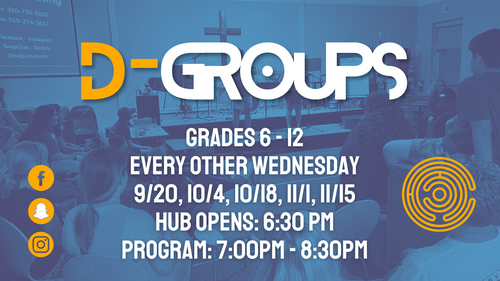Disciple Groups for grades 6th - 12th start THIS Wednesday and will meet every other Wednesday. The HUB will open at 6:30 pm with the program starting at 7:00 pm. Contact Jen Phelps for details.