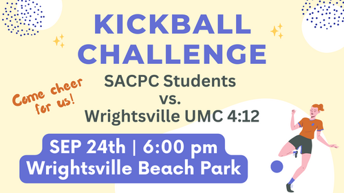 Wrightsville United Methodist youth group to a kickball game! Come to play or come to cheer for your SACPC Superheros - all are welcome to a night out at the park to cheer for our youth.