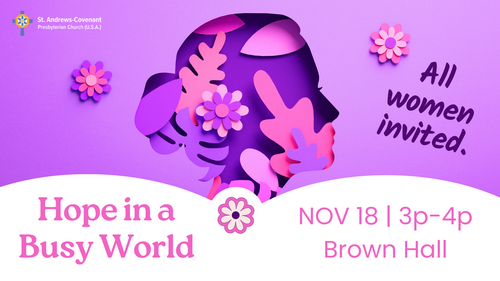Calling ALL women!! Are you tired, burned out, weary, lonely, young, old, single, married, worried, happy, and all the inbetweens? We see you. We hear you. Come gather. Bring your friends, neighbors, and co-workers to this special event just for you. Childcare provided. More details coming soon, but first--mark your calendars for Saturday, November 18th from 3:00 pm - 4:00 pm in Brown Hall. This will be a day of togetherness you didn't know you needed--until you did.
