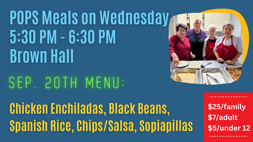 Dinner is from 5:30 - 6:30 pm. The menu this Wednesday is chicken enchiladas, Mexican black beans, Spanish rice, chips/salsa, and sopiapillas. Cost is $25/family, $7/adult, $5/under 12.