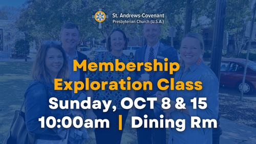 Are you interested in learning more about SACPC and/or becoming a member? Join us for our membership exploration class on October 8th and 15th at 10:00 am in the Dining Room. Led by Rev. Harrington, this class will be a general overview of St. Andrews-Covenant and our ministries, as well as what it means to be part of the Presbyterian Church (USA).