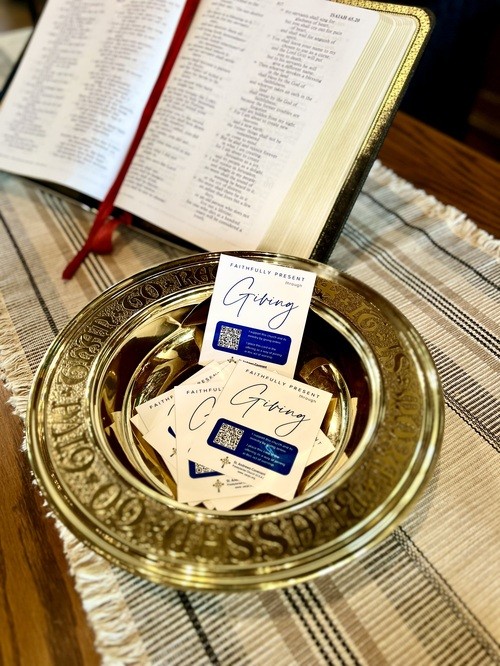 Starting Sunday, worshipers who prefer to give electronically will have the opportunity to fully participate during the offertory at both worship services. We now have laminated giving/prayer cards located at every pew. During the offertory, as ushers pass the collection plates we invite all who give electronically, and also those seeking prayer requests, to place a card in the collection plate. QR codes are available on the giving or prayer side of the cards for anyone wanting to submit a prayer request via our website or give online.