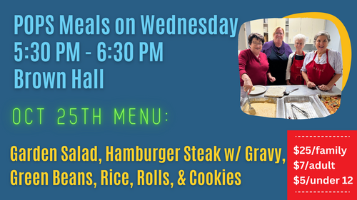 Dinner is from 5:30 pm - 6:30 pm. The menu this Wednesday is Garden Salad, Hamburger Steak w/ Gravy, Green Beans, Rice, Rolls, and Cookies. Cost is $25/family, $7/adult, $5/under 12.
