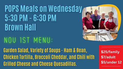 Dinner is from 5:30 pm - 6:30 pm. The menu this Wednesday is Garden salad, a variety of soups (ham and beans, chicken tortilla, broccoli cheddar, and chili) with grilled cheese and cheese quesadillas. Cost is $25/family, $7/adult, $5/under 12.