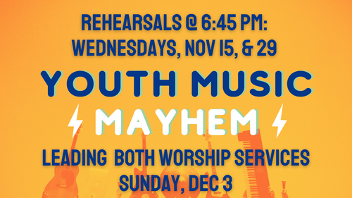 All of our middle and high school youth are invited to make a joyful noise together! We will be incorporating singing into our Wednesday night gatherings in preparation to help lead worship on Sunday, December 3rd during both the 9:00 am and 11:00 am services. Rehearsals will be at 6:45 pm in The HUB on November 15th. On November 29th, we will meet for dinner at 6:30 pm in Brown Hall and then head to the sanctuary for rehearsal. See Jen Phelps for more details.