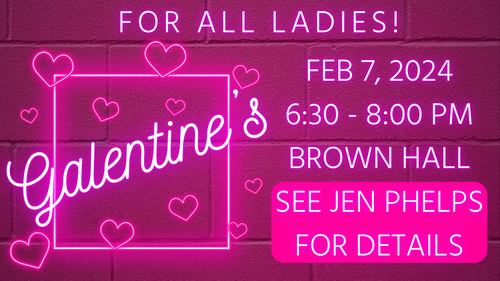 Each year our middle and high school girls celebrate Galentines - and this year we are inviting all ladies of all ages to join us! We will gather in Brown Hall on Wednesday, February 7th from 6:30 pm - 8:00 pm (after POPS) for fun and fellowship and chocolate fountains. Please bring items for dipping to share!