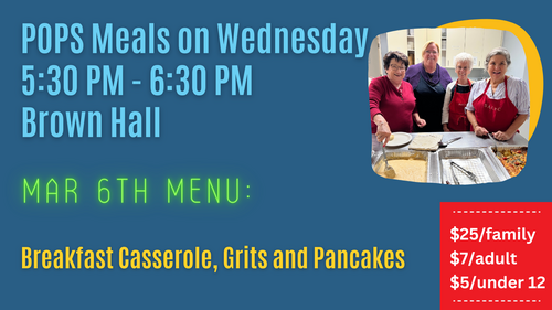 This week's menu: Breakfast Casserole, Grits and Pancakes. Cost is $25/family of 4 or more, $7/adult, and $5/under 12.