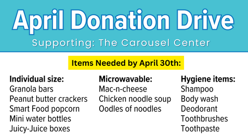 This month we’ll be helping victims of child abuse that our neighbor, The Carousel Center, serves with love and compassion. They need individual packages of granola bars, peanut butter crackers, Smart Food popcorn, microwavable single-serve lunches of mac-n-cheese, chicken noodle soup, oodles of noodles, little water bottles, juicy juice boxes, and hygiene items of shampoo, body wash, deodorant, toothbrushes & toothpaste.