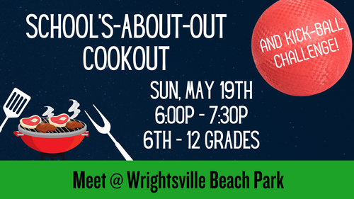 All 6th - 12th grades are invited to attend. We will gather at Wrightsville Beach Park for a cookout and our KICKBALL CHALLENGE with SACPC Elders and Deacons!
