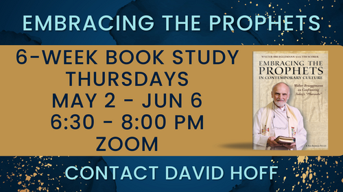 Join us for a 6-week Zoom book study every Thursday from May 2nd - June 6th at 6:30 pm. We will explore Old Testament scholar Walter Breuggemann's series, "Embracing the Prophets in Contemporary Culture: Confronting Today's 'Pharaohs'." This class is led by Dave Hoff and Sue McCaffray. There is some reading each week to prepare for class, and a short video that we watch together. Email Dave Hoff for more information and to get the zoom link.