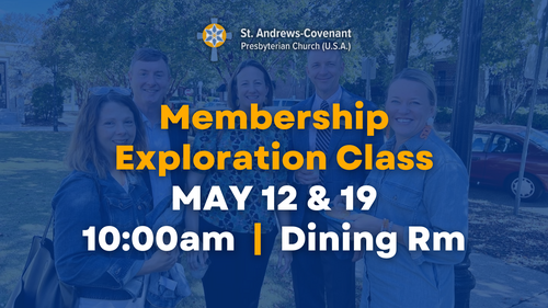 Are you interested in learning more about SACPC and/or becoming a member? Join us for our membership exploration class on May 12th & 19th at 10:00 am in the Dining Room. Rev. Harrington will lead this class with a general overview of St. Andrews-Covenant and our ministries, as well as what it means to be part of the Presbyterian Church (USA).