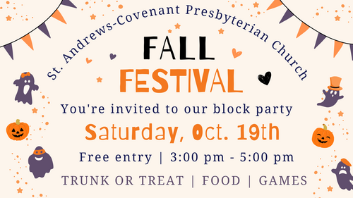 Save the Date for our Fall Festival! We are joining with The Block tenants to put on a festival for the community including food, games, and a Trunk-or-Treat! More info coming soon. See Ann Danchak for details.