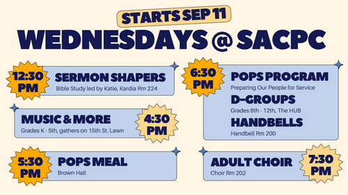 Come celebrate the end of summer and get plugged in with all the things happening in and with SACPC this fall! There will be food, games, prizes, and a special mission project. Find your people and maybe your purpose in serving in our ministries.