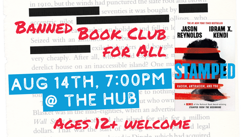 Our next Banned Book Club book is Stamped: Racism, Antiracism, and You; A Remix of the National Book Award-winning Stamped from the Beginning (AGES 12 & UP). We will meet in person this time at The HUB for discussion and desserts. Amy Stuart will be leading our discussion. We are welcoming any that want to be included, but we are reading the young adult version recommended for ages 12 and up. Parents are encouraged to read the book along with their students!
