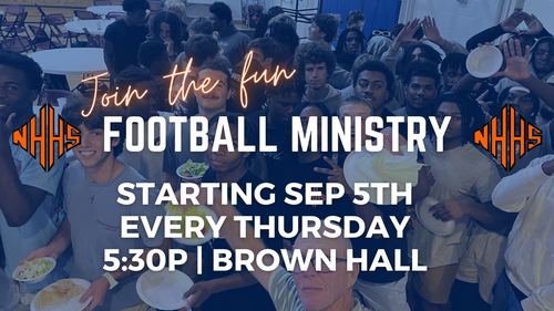 Starting Thursday, September 5th our Men’s Football Ministry will host the NHHS football team for their weekly “pre-game” team meal. While many of us have been lounging on the beach during these hot summer months, the NHHS football players have been sweating it out on the practice field preparing for another football season. Please feel free to join us this fall. This ministry is a wonderful avenue to fellowship with our neighborhood high school football team. If you have questions please feel free to call me and/or Russell Herring. Go Wildcats!