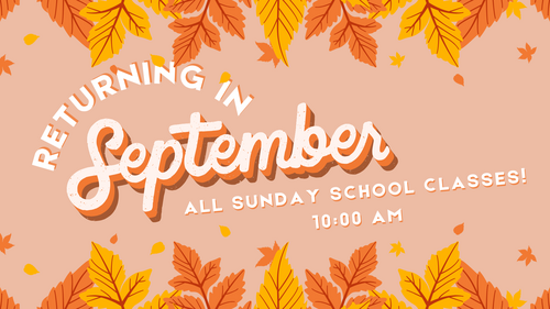 If you have been enjoying a summer break mark your calendar for the return of all Sunday school classes in September. Many adult classes have been meeting regularly throughout the summer; however, all classes will resume (or continue) as our new school year begins.