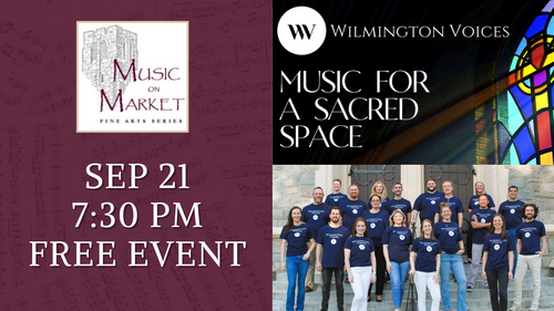 Music on Market is proud to bring Wilmington Voices to its concert series. They will present Music for a Sacred Space, an evening of choral music that is not only a celebration of artistic excellence but also a testament to the enduring power of music. They seek to create a sense of peace and reverence in the hallowed confines of a sacred sanctuary, transcending boundaries and uniting hearts in a shared journey through sublime music. Whether one seeks solace, inspiration, or simply an opportunity to bask in the beauty of choral harmonies, this concert promises to be a memorable and uplifting experience for all who attend.