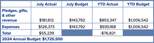 As of the end of July, giving is below budget expectations, resulting in a year-to-date shortfall of $76,821. So that we can continue to spread the Word of God, as well as serve our congregation and the community, please prayerfully consider giving to help rebound from this deficit.