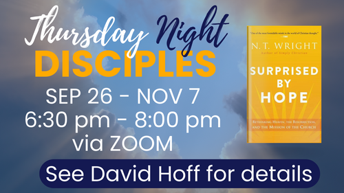 Join the small band of Thursday Night Disciples as we spend six weeks reading noted New Testament scholar N.T. Wright's book, Surprised by Hope. Wright addresses the hope of the resurrection, of heaven, of the second coming of Jesus, of salvation, of the church. Starting Sept. 26th, we'll meet by Zoom on Thursdays from 6:30 pm - 8:00 pm. We will each purchase a participant's guide and the book. There will be some reading to do each week. A great way to meet up with friends from the comfort of your own home. Contact Dave Hoff for details on how to sign up.