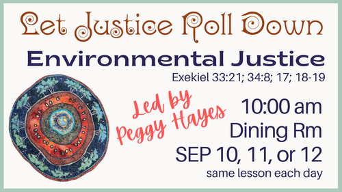 God calls us to protect the created world we share and need from environmental degradation and destruction. For September, Peggy Hayes will facilitate this Bible study on Environmental Justice using scripture from Ezekiel 33:21; 34:8; 17; 18-19. The same lesson will be given on September 10th, 11th, and 12th at 10:00 am in the Dining Rm. All are welcome to join this church-wide Bible study sponsored by the Presbyterian Women. Contact Katherine Brandi for more details.