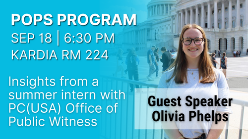 Our POPS series, Let's Talk About the Great Ends of the Church, continues as our very own Olivia Phelps shares insights from her work in Washington, DC as a Summer Fellow for the PC(USA) Office of Public Witness. Join us for dinner in Brown Hall from 5:30 pm - 6:30 pm. The program starts at 6:30 pm in the Kardia Room, 224. Everybody's welcome!