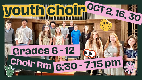 We are excited to announce that the youth choir will begin starting Oct. 2nd. Rehearsals will be from 6:30 pm - 7:15 pm in the Choir Rm every other Wednesday, alternating with D-Groups so students can attend both D-Groups and Youth Choir. Rehearsal dates are: 10/16, 10/30, 11/13, 12/4. We will sing in worship on Dec. 8th at 10:00 am. All are welcome! Invite your friends. See Angela Burns for details.
