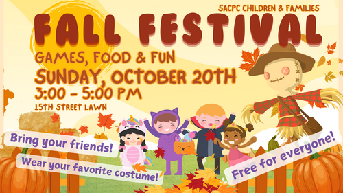 Come join our annual Fall Festival for Children & Families, put on by the SACPC Children's Ministry. There will be games, crafts, snacks, photo-ops, face painting & Trunk or Treat! This event is free to all! Come and have fun! Great event for children and families!! This is a rain-or-shine event, the rain location will be Brown Hall. See Mrs. Lynn for more details.
