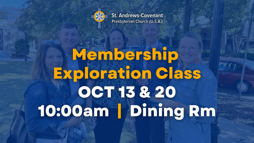 Are you interested in learning more about SACPC and/or becoming a member? Join us for our membership exploration class on October 13th & 20th at 10:00 am in the Dining Room. Rev. Harrington will lead this class with a general overview of St. Andrews-Covenant and our ministries, as well as what it means to be part of the Presbyterian Church (USA).