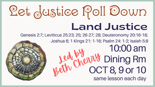 .For October, Beth Cherry will facilitate this Bible study on Land Justice using scripture from Genesis 2:7; Leviticus 25:23; 25; 26-27; 28; Deuteronomy 20:16-18; Joshua 6; 1 Kings 21: 1-16; Psalm 24: 1-2; Isaiah 5:8. Scriptural accounts of divinely ordered conquest and laws of Jubilee that support the rights of individual landowners stand in tension but are rooted in the perception that all the earth is God’s.