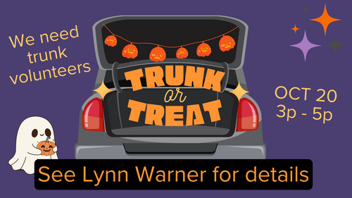 We have five sets of decorations for five vehicles and we would be willing to help provide candy or prizes for you to give out at your vehicle. The Fall Festival is on Sunday, Oct. 20th from 3:00 pm - 5:00 pm on the 15th St. Lawn. Contact Lynn Warners for details.