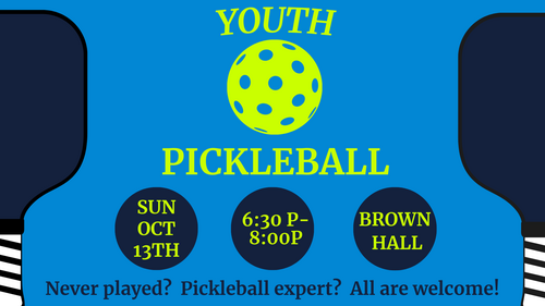 We will gather in Brown Hall to try out the new Pickleball courts! All youth (grades 6th - 12th) are welcome - no experience necessary. We will have some adults there to teach basic skills.