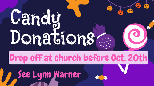 We would welcome donations of candy or individual snack bags to be given out as part of our Fall Festival/Trunk or Treat to be held on Sunday, October 20th from 3-5 p.m here at the church! Contact Lynn Warner or drop donations off at the church office. Thank you in advance for your help!