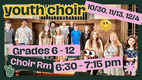 Youth choir rehearsals are from 6:30 pm - 7:15 pm in the Choir Rm every other Wednesday, alternating with D-Groups so students can attend both D-Groups and Youth Choir. Remaining rehearsal dates are: 10/30, 11/13, 12/4. We will sing in worship on Dec. 8th at 10:00 am. All are welcome! Invite your friends. See Angela Burns for details.