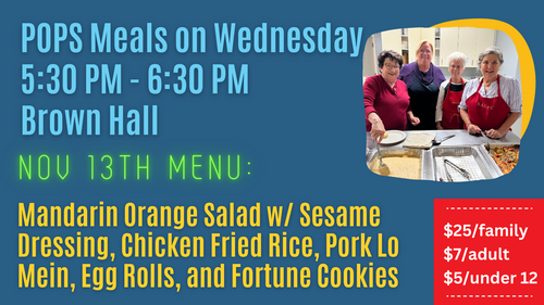 Menu: Salad, Mandarin Orange Salad w/ Sesame Dressing, Chicken Fried Rice, Pork Lo Mein, Egg Rolls, and Fortune Cookies. Cost is $25/family, $7/adult, and $5/under 12.