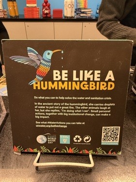 While in the UN gift shop, I came across a lapel pin of a hummingbird. It was part of last year's UN World Water Day campaign encouraging people to Be Like A Hummingbird.