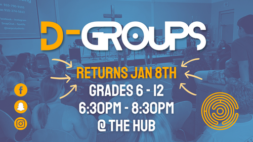 Our middle and high school students gather for fellowship, fun, Bible Study and our small group ministry beginning January 8th. DGroups meet EVERY OTHER Wednesday. The HUB opens at 6:30 pm and programming begins at 7:00 pm. See Jen Phelps for more details.