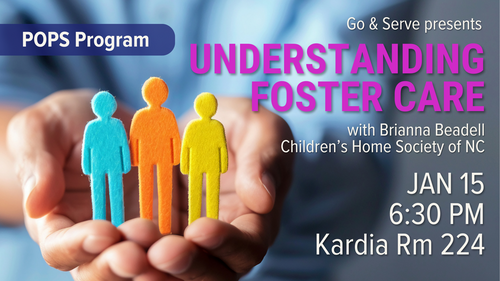 Go and Serve presents guest speaker Brianna Beadell, family recruitment specialist for the Children’s Home Society of North Carolina. Brianna will talk about foster care and what it involves. Foster care is a unique opportunity to serve at risk children in the county. Even those for whom foster care is not an option, however, will learn how they can best support those who are called to serve in this way.