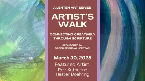 In 2011, while she was an intern at SACPC, Rev. Katherine Hester Doehring gave the congregation a particularly memorable worship experience on an August Sunday morning. She brought paints and canvas and painted “live” throughout the service as the Scripture passages spoke to her of the Living Water. As she listened and painted, she connected the water flowing from Creation through God’s provision in the wilderness in Exodus, through the Psalms of thirst and to the Jordan River for the baptism of Jesus, the true Living Water.