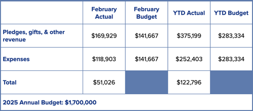 Financial updates will be provided each month. If you have any questions, please contact Susan Dykes, Financial Administrator, 910-762-9693x207, sdykes@sacpc.org; or our Church Treasurer, Ed Hobson, treasurer@sacpc.org.