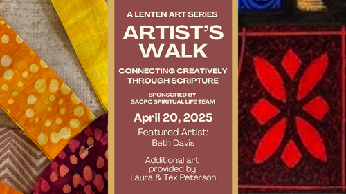 Her beautiful designs and handiwork will be enjoyed at SACPC for years to come. Now you’ll see the joy of Easter morning in both her Easter parament and pastors’ stoles. Beth was inspired by the image of the sun rising on the empty cross — a simple and profound symbol of the victory of Christ’s resurrection.