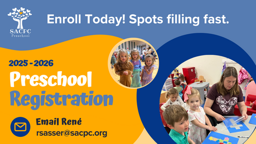 Registration for preschool is going well. Some classes are full and others are filling up quickly. We do have some spots available and would love to have your child, grandchild, or friend join us. We offer 2, 3 and 5 day options. Please email René for more information or to schedule a tour. We would love to meet you and share more information about our school!