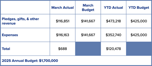 Financial updates will be provided each month. If you have any questions, please contact Susan Dykes, Financial Administrator, 910-762-9693x207, sdykes@sacpc.org; or our Church Treasurer, Ed Hobson, treasurer@sacpc.org.